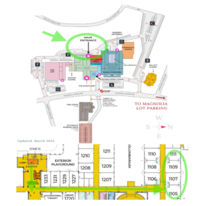 Please use the door closest to the playground and roundabout.This door is usually locked. The church office will typically buzz you in. Alternatively, you can contact a site staff member for assistance upon arrival.Parking is open and available to all visitors.Once you enter through the designated door, head straight down the hallway and turn left. All of our classrooms are located along that hallway.